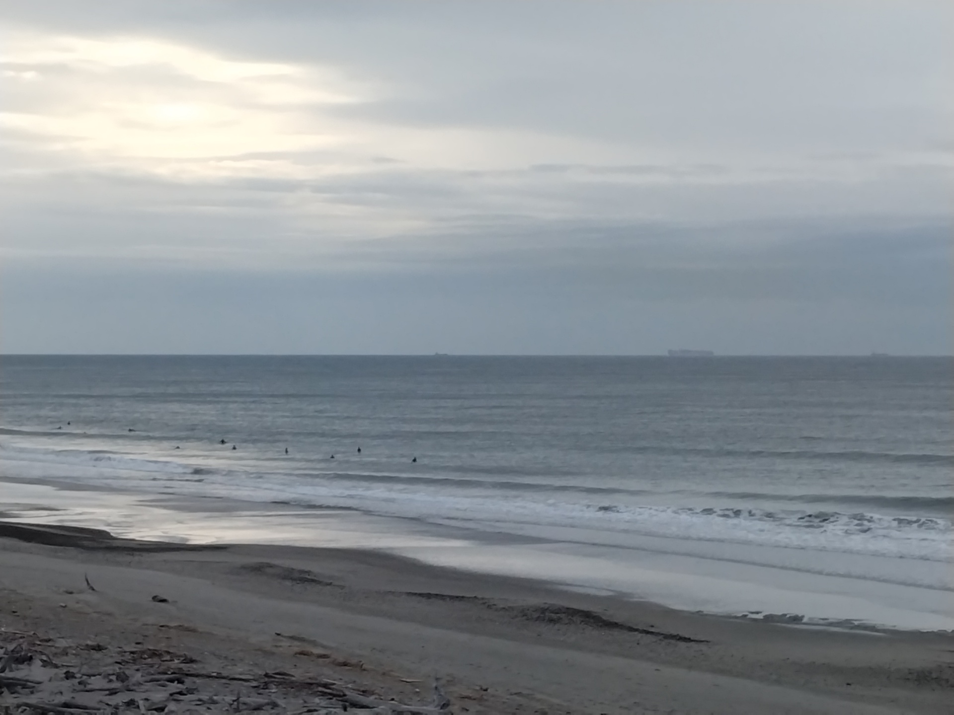 7時半のロングビーチは、風北東10mで、波は腿~腰くらいです。週末でメロン~正面が混雑してます。坂下Pは10数人サーファー入ってます。北東が強めなんで、内海方面でのウィンド、ウィングも早い時間帯ならできそうですね。