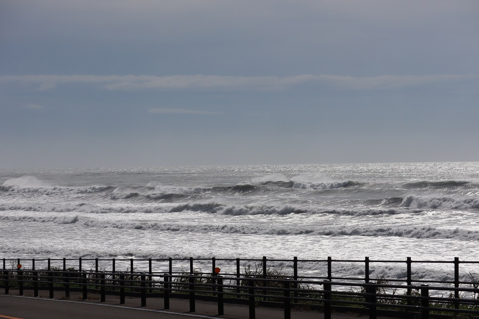 北北東4m、雲が取れて晴れてきました。波は引き続き台風のうねりでセット間ありますが、セットは頭半~誰も入ってません。風も収まり、波も落ち着いては来ていますが、状況をよくみて、海は十分気を付けましょう。