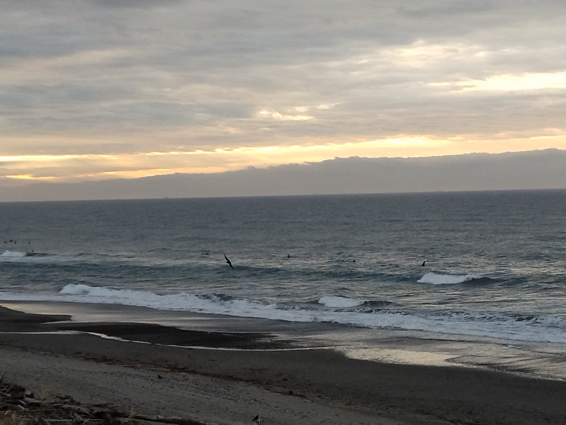 6時半のロングビーチは、風西北西4mで、波は腰くらいで風が絡んだまとまりのない感じの波です。正面Pにサーファー集まってます。曇り空の涼しい朝です。