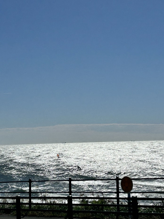 西風13m、晴れ、波は小さくセットで腿腰サイズ、風はオフ気味でインサイド抜け気味ですがアウトは吹いてます。坂下にウインド5人、正面にサーファー2人入ってます。今日も一日西風予報、朝は気温が下がって肌寒い朝でしたが日中は暖かくなりそうですね。