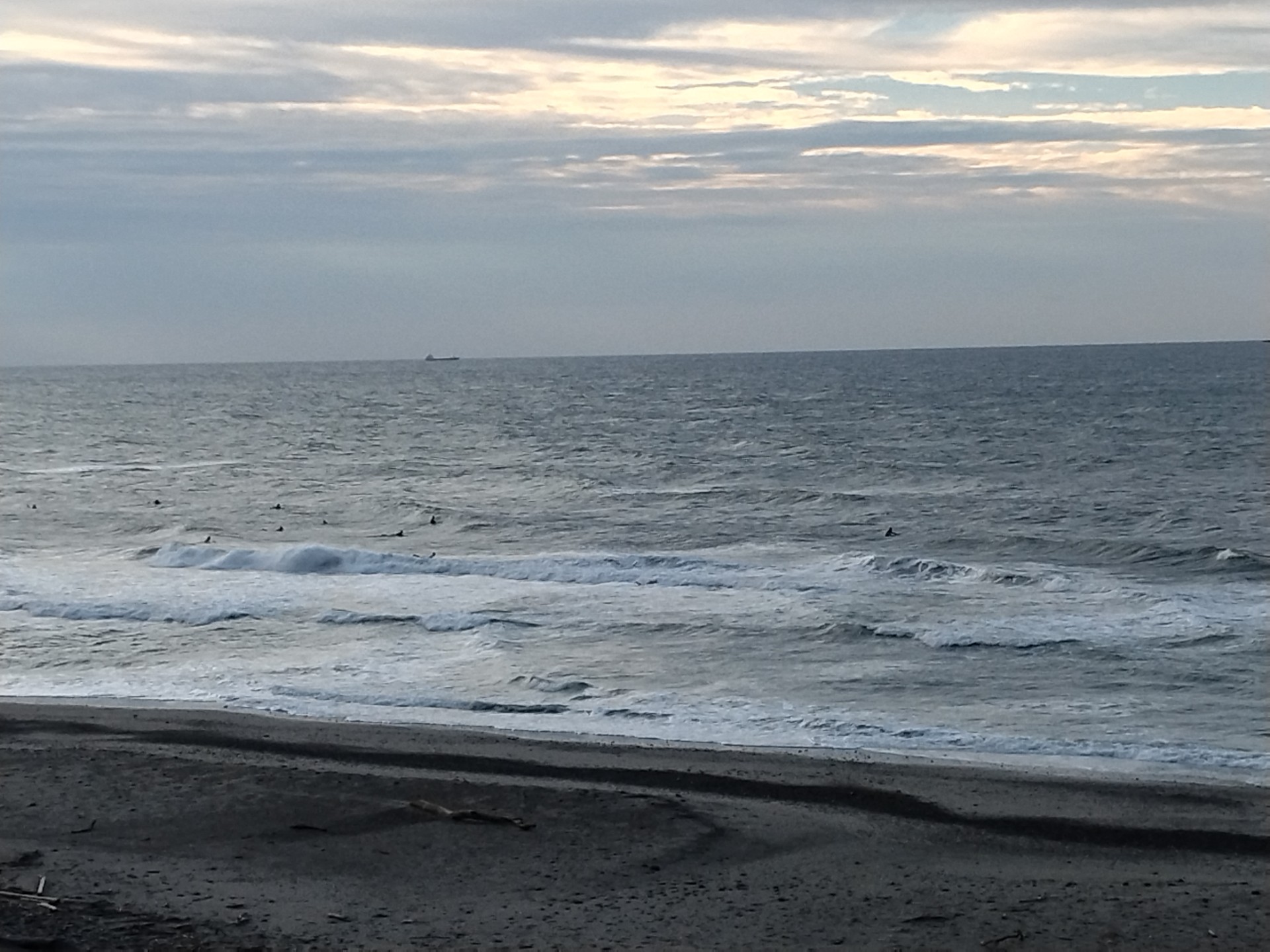 7時のロングビーチは、風西12mで、波は腰~腹くらいです。風が絡んだ波で、坂下Pには20人位サーファー入ってます。今日はメインPでサーフィンの大会が開催されてますので、ウィンドは坂下Pより東側には行かないように注意してください。昨日よりマイルドなコンディションの予報です。