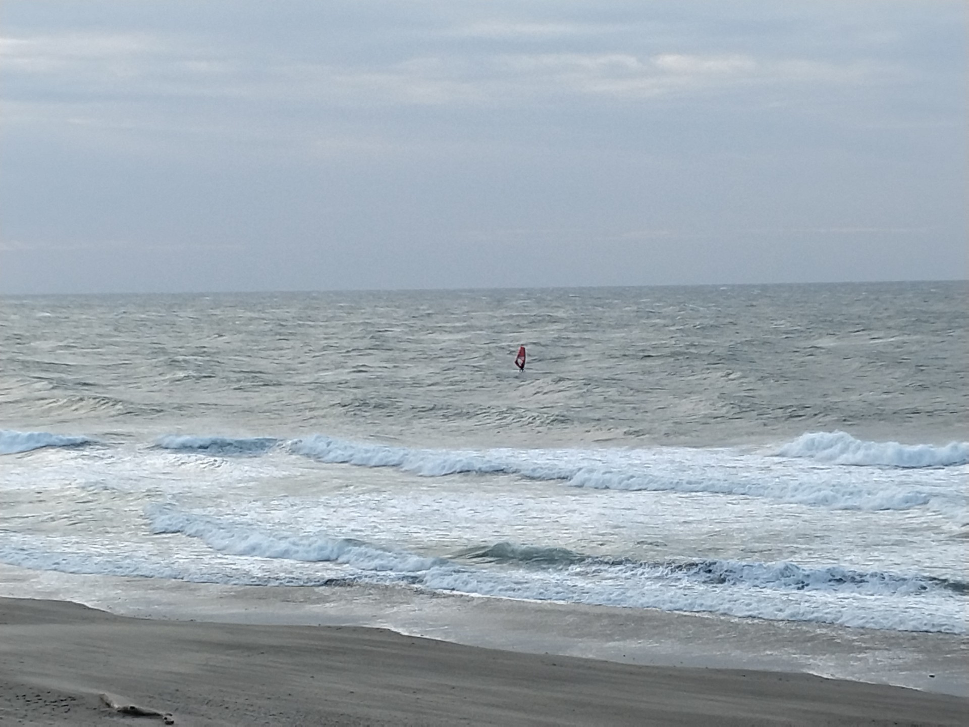 7時半のロングビーチは、風西18mで、波は胸~肩、沖のウネリで頭くらいです。風速の割には吹いてない海面で、現在3人ウィンドサーファー出廷してます。4.0㎡くらいで、海面も良さそうです。これから、ガッチリ風入ってきそうです。寒さもなく、楽しめそうな1日です。