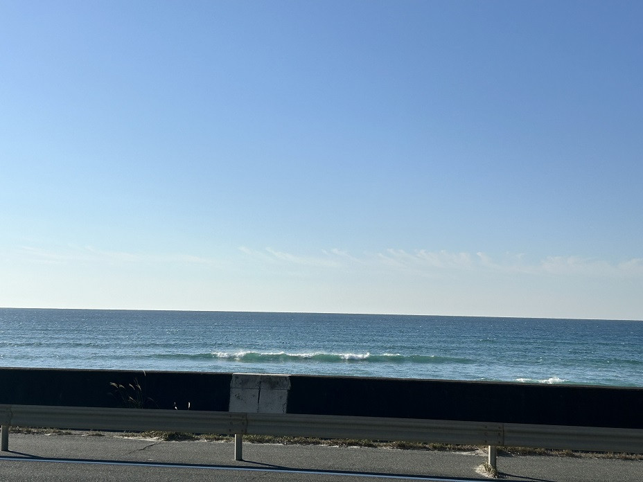 西風8m、晴れ、波は小さくセットで膝腿サイズ。トップのみ割れるてくる感じです。風は白波入ってきてます。正面にサーファー1人です。今日、明日は西風予報、波は小さいながらも風はばっちり吹きそうですね。