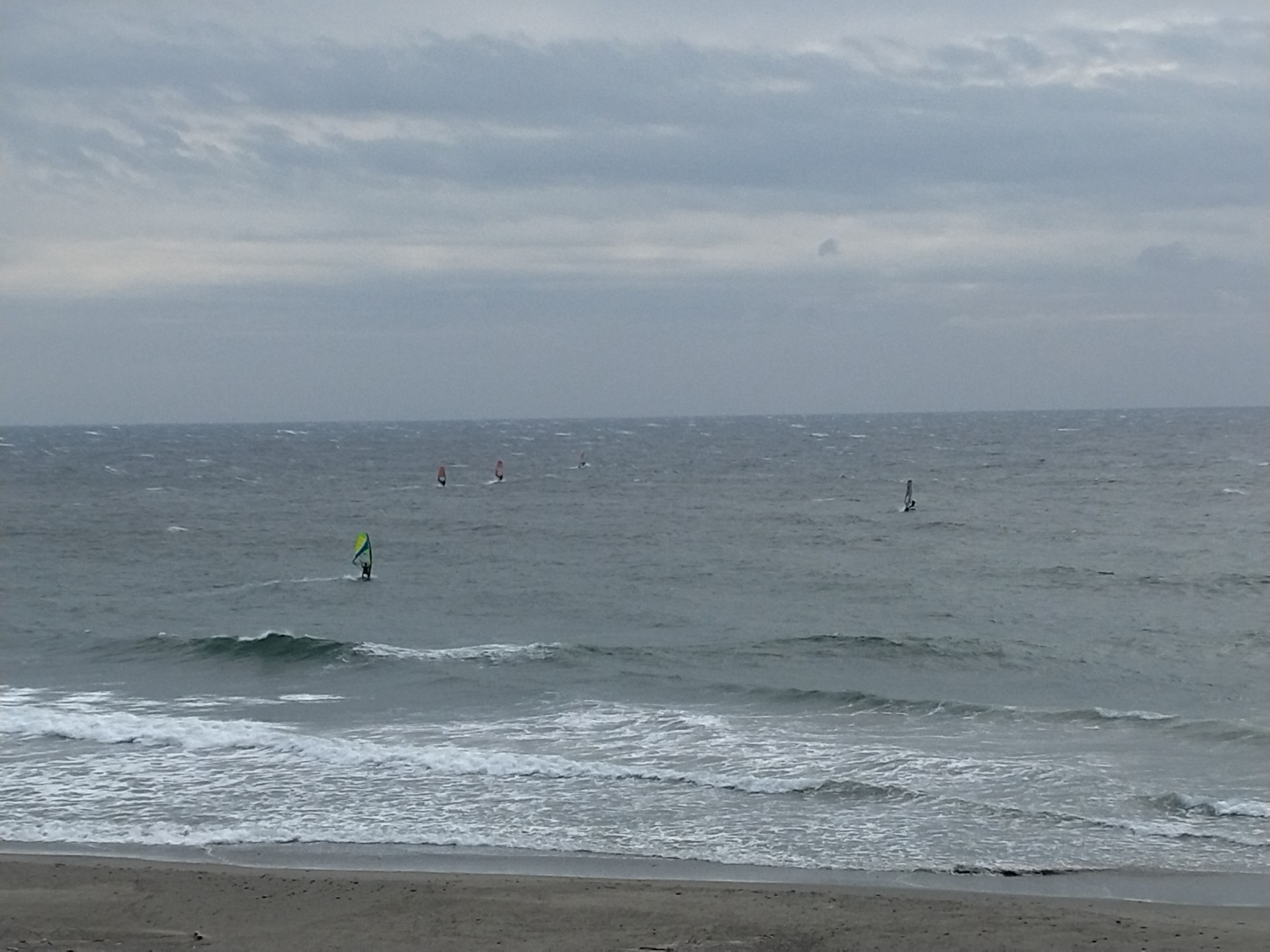 13時のロングビーチは、風西13mで、波は腰~腹くらいです。インサイド少し風抜け気味で、少しオフっぽいです。今10数人ウィンドサーファーが出廷して、4.0㎡前後って感じです。寒さはまだそれほどでもないです。明日寒くなりそうですね。