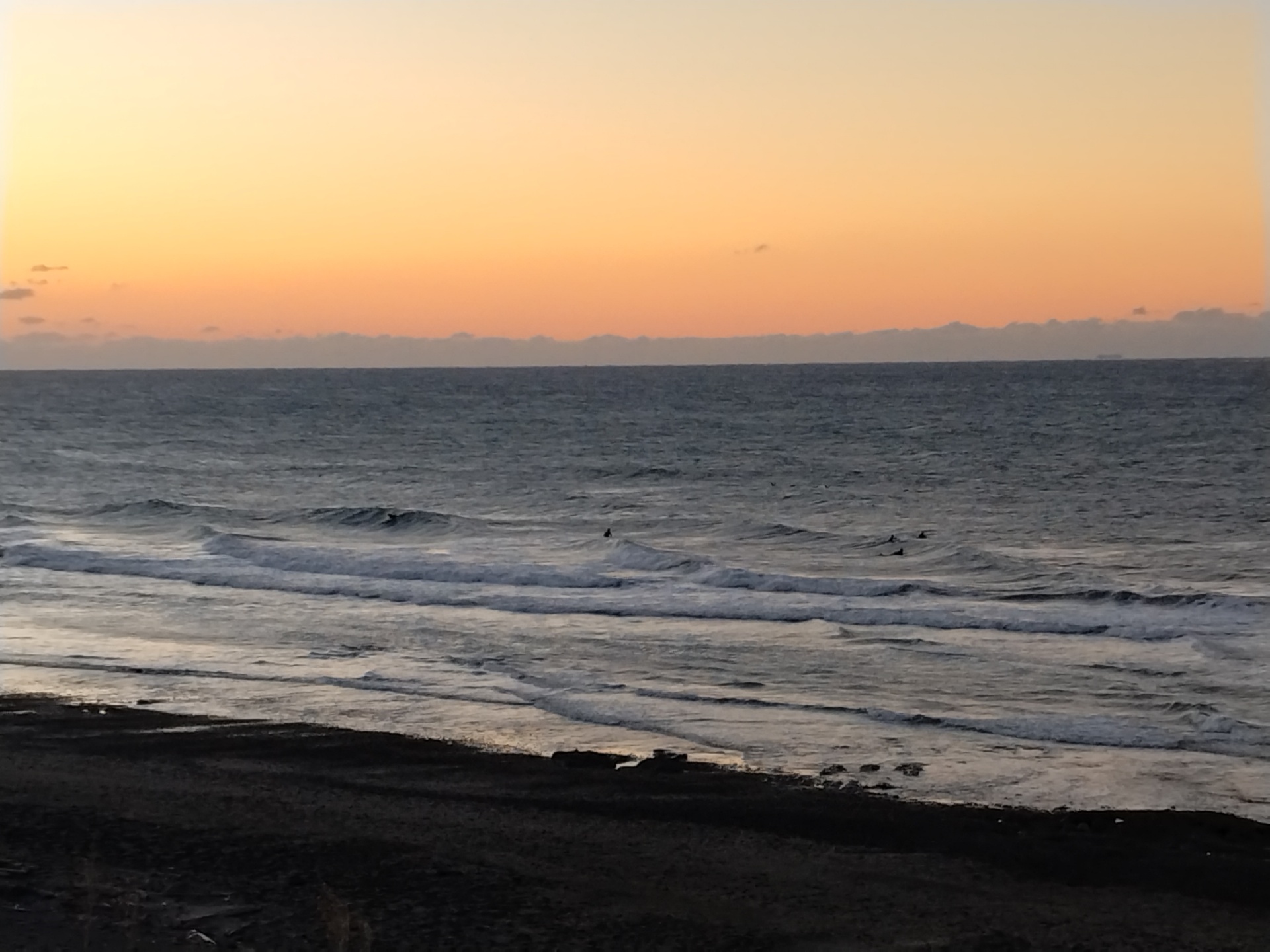 7時のロングビーチは、風で、波は腹くらいです。坂下に7人サーファー入っていて、面はまだ良さそうです。今日は昼過ぎに西風上がってくる予報ですが、今はアウトに白波がチラホラ見える感じです。お湯サービスは、工事が終わり利用できるようになりました。