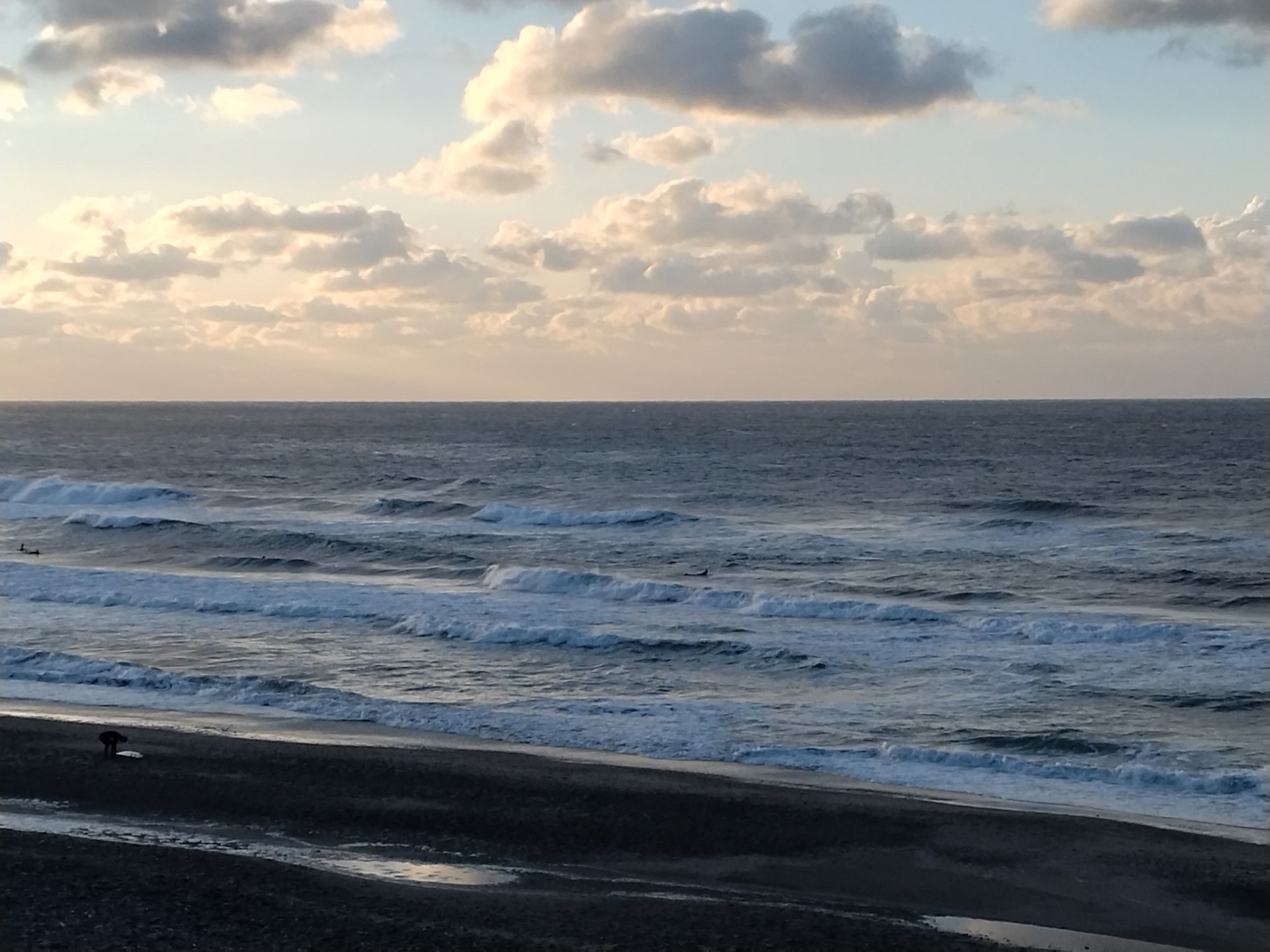 7時半のロングビーチは、風西9mで、波は胸~肩くらいです。昨日の朝よりサイズはあります。まだインサイド風が弱く、坂下にサーファー15人入ってます。波のサイズがあるので、風吹き始めの少し風弱めの時間は良いコンデションが期待できるかも。今日も強風予報なので、昼前にはドン吹きになりそうですね。坂下の川より東側のインサイドの流れがかなり強めですので気を付けましょう。
