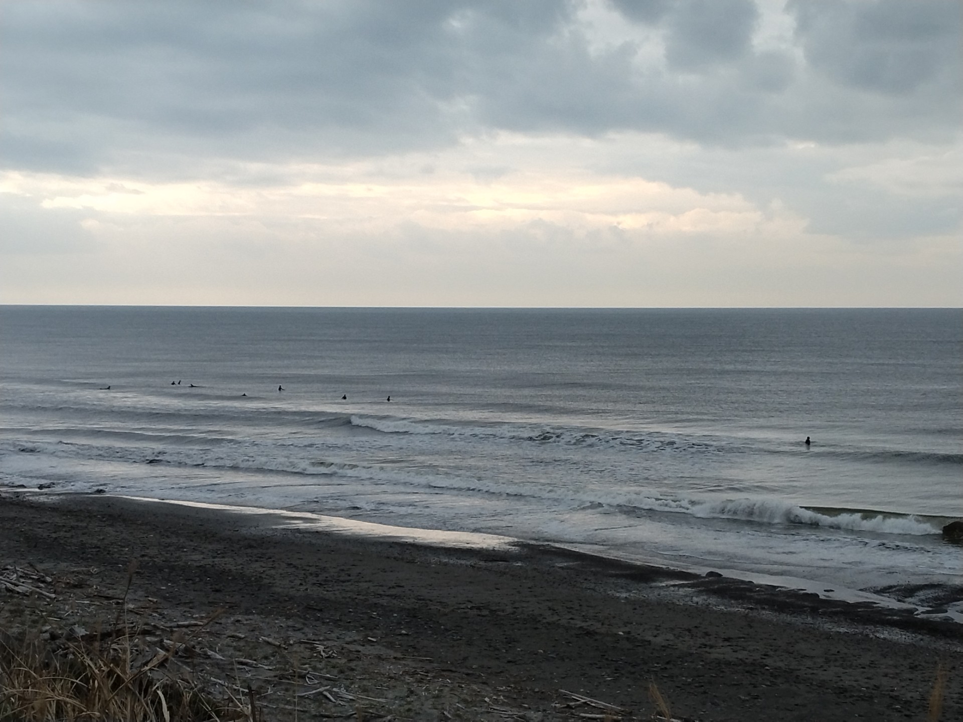 7時半のロングビーチは、風北7mで、波は腰~腹くらいです。面ツルで小さいですが、たまに良さそうな波も来てます。小雨がぱらついてきて、肌サムい朝です。