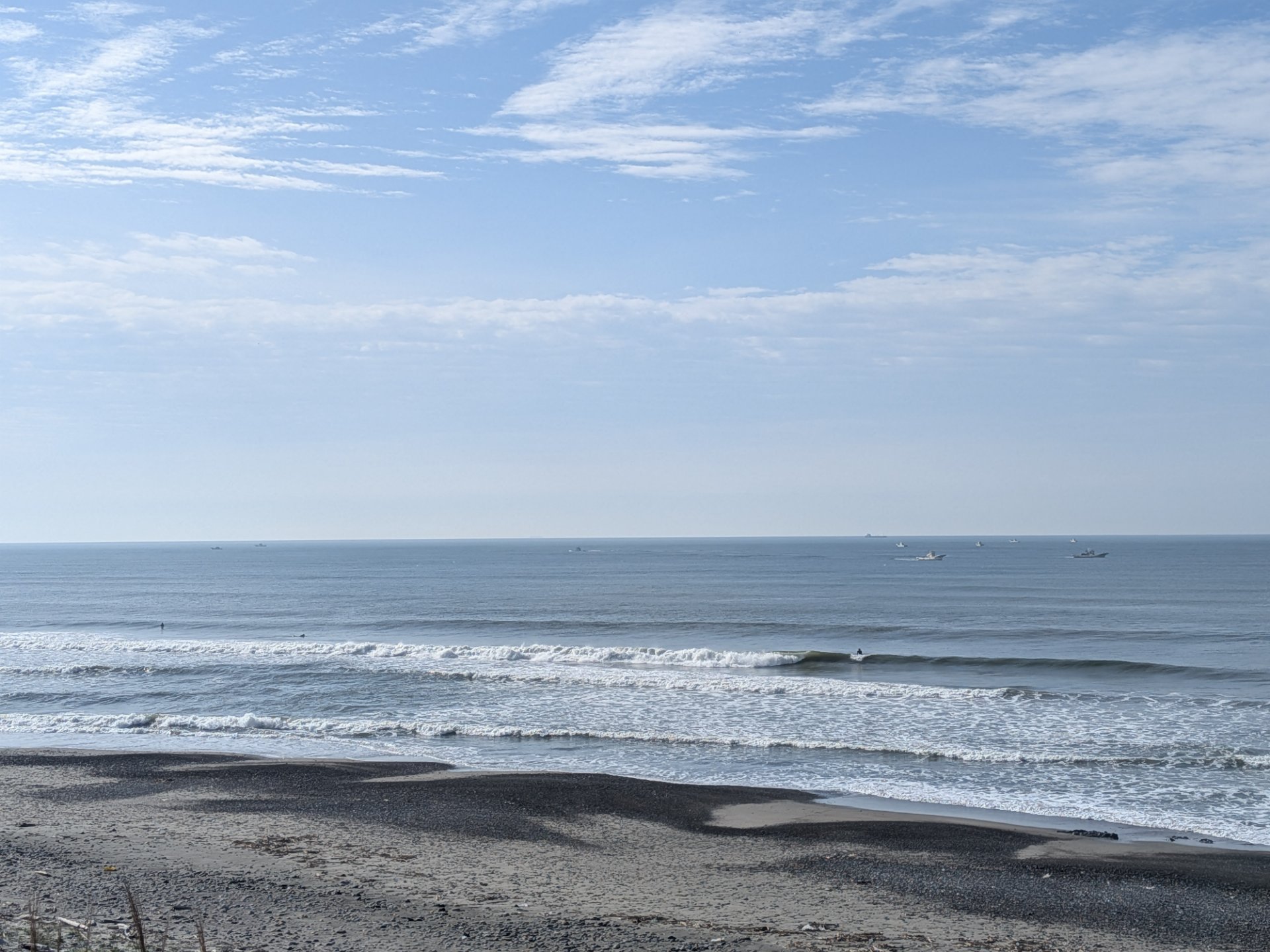 8時のロングビーチは、風北5mで、波は腿~腰くらいです。面ツルですが、タル早なブレイクです。正面に約10人、坂下に3人サーファー入ってます。朝、晩は涼しく、日中はTシャツでよく、気持ちの良い穏やかな日でいいですね。