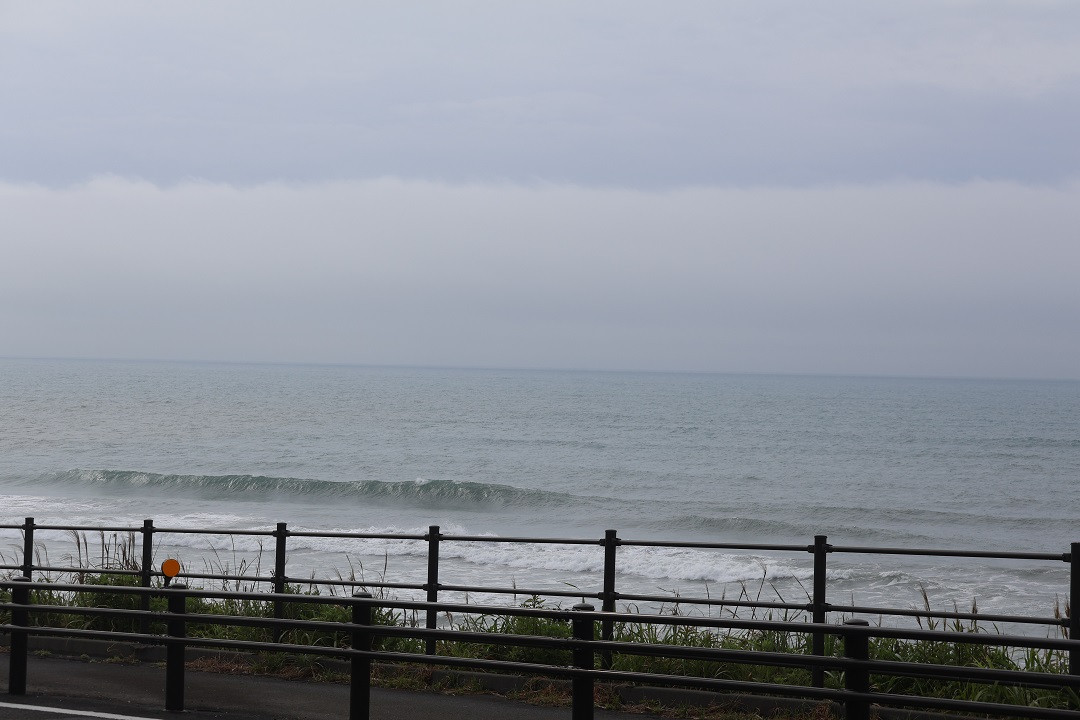 西南西8m、曇り、波はセットで胸~サイズ。雨が上がって、風が西になり白波入り始めてます。メロン下にサーファー1人です。今日はこれから西風強風予報、波付きでタン締めそうですね。日中は気温も上がりそうです。