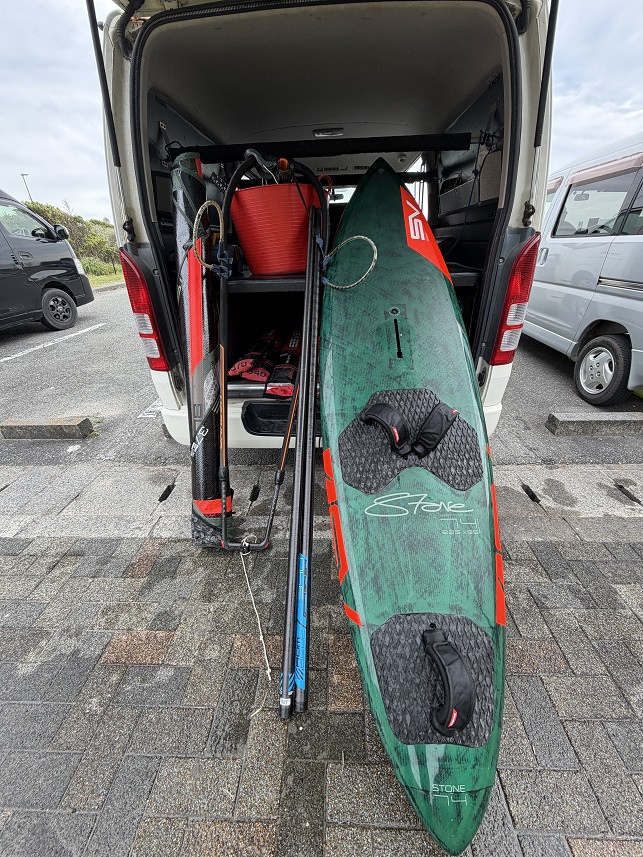 3.7㎡ Blade 74L Stoneで昼から乗りました。風はジャスト~アンダーで胸肩サイズのうねりが残っていて、ラインナップしてくる感じで楽しめました。干きいっぱいは、岩も出ておりインサイド流れも速くて要注意です。風は落ちましたが4点台後半ならまだ乗れています。フルスーツでばっちりでした。夕方どうかな?
